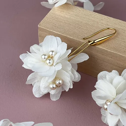 - Boucles d’oreilles en fleurs d’hortensia stabilisé blanc & perles